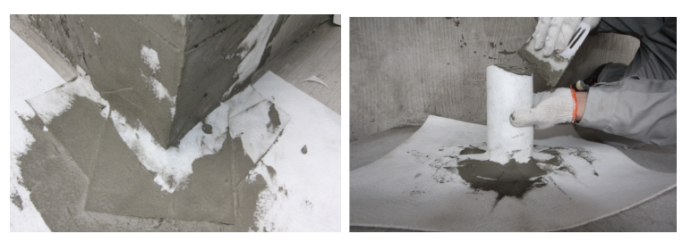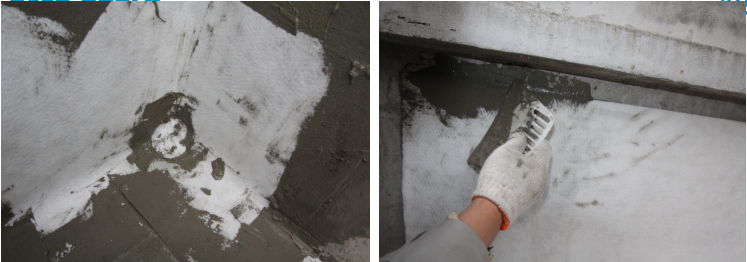 五、施工工藝 濕鋪法: 清理基面→濕潤(rùn)基層(如基層濕潤(rùn)無(wú)需此項(xiàng)工序)→定位、彈線→攪拌并鋪抹水泥漿-→節(jié)點(diǎn)部位加強(qiáng)處理→鋪貼防水卷材→提漿、排氣、晾放→搭接邊密封→卷材收頭、密封→檢查驗(yàn)收 施工要點(diǎn): 1、基層清理: 1.1基層表面已清理干凈,并基本平整,無(wú)明顯突出部位 1.2施工時(shí)基面必須濕潤(rùn)但不得有明水, 1.3各種管道、預(yù)埋構(gòu)、配件已安裝完畢,固定牢固 2、定位、彈線:在基層面排尺彈線,作為掌握鋪貼的標(biāo)準(zhǔn)線,使其鋪設(shè)平直; 3、膠粘劑的制作配備 3.1大面:按水:水泥:專用膠粉=0.6:1:0.004的重量比配制水泥膠粘劑。立面:按水:水泥:專用膠粉=0.4:1:0.004的重量比配制水泥膠粘劑。 按比例準(zhǔn)備好足量的水、膠粉、水泥,將膠粉緩慢加入水中,邊加邊攪拌,使膠粉均勻分散在水中。待膠粉分散均勻后,加入水泥,邊加邊攪拌,待攪拌均勻后方可使用。 3.2水泥浸泡到不連續(xù)出現(xiàn)氣泡后(15-20min),再開(kāi)始攪拌至均勻。 3.3水泥膠粘劑稠度具有流動(dòng)性即可使用。 3.4攪拌好的水泥漿料應(yīng)在3-4h內(nèi)用完。 4、鋪貼卷材 4.1鋪貼時(shí),采用趕漿法進(jìn)行施工,先將成卷的卷材放在需要鋪貼的起始部位,然后沿鋪設(shè)方向涂刷水泥粘結(jié)膠漿,并將卷材展開(kāi)沿彈好的標(biāo)準(zhǔn)線向另一端鋪貼,操作時(shí),卷材不要拉太緊,并注意方向沿標(biāo)準(zhǔn)線進(jìn)行,以保證卷材搭接寬度,同時(shí)用滾子壓實(shí)、壓平,中間不得有氣泡,以保證卷材與基層的粘結(jié)強(qiáng)度; 4.2鋪設(shè)下一幅卷材時(shí),一定要注意與上一幅卷材搭接,搭接寬度不低于100mm,并注意粘結(jié)膠漿應(yīng)在卷材邊全部擠壓出漿; 4.3卷材不得在陰陽(yáng)角接頭,接頭處應(yīng)間隔錯(cuò)開(kāi); 4.4操作中排氣:每鋪完一張卷材,應(yīng)立即用干凈的滾刷從卷材的一端開(kāi)始橫向用力滾壓一遍,以便空氣排出。 4.5搭接邊及卷材收頭用稠漿密封嚴(yán)實(shí)。 5、細(xì)部節(jié)點(diǎn)處理 1、陽(yáng)角、陰角: 1.1將陽(yáng)角、陰角部位浮漿、雜物鏟除,清理干凈后,若基面干燥時(shí)散水濕潤(rùn),掃除明水。 1.2陽(yáng)角、陰角用水泥砂漿或防水砂漿抹成圓弧,圓弧半徑不小于50mm。 1.3裁剪一條寬500mm的卷材作為陽(yáng)角或陰角附加防水層,然后涂刷水泥膠粘劑鋪設(shè)。 1.4陽(yáng)角、陰角交接處附加層卷材在中心位置向一邊方向裁開(kāi),在方形卷材底部中間處劃一刀到卷材中心點(diǎn),使得卷材下沿叉開(kāi),然后涂刷水泥膠粘劑鋪設(shè)。 1.5再裁剪一塊(略成扇形)卷材,涂刷水泥膠粘劑后鋪設(shè)在開(kāi)叉處的上面,將露出部位全部遮蓋。 2、管根部位: 2.1清理管根部位四周基面及管道壁,鐵管進(jìn)行除銹打磨,PVC管表面用鋼絲刷打磨粗糙,基面若基面干燥時(shí)散水濕潤(rùn),掃除明水。 2.2在管根部涂刷水泥膠粘劑,立面250mm高,平面超出洞口250mm寬。 2.3根據(jù)管道外徑剪一塊方形卷材,尺寸比管根半徑長(zhǎng)250mm,沿著卷材中心,劃開(kāi)呈十字狀或米字狀的缺口,將劃開(kāi)的卷材套入管道用滿粘法將卷材鋪設(shè)。 2.4根據(jù)管道外徑裁剪一條長(zhǎng)度大于管徑100mm,寬度不小于250mm的卷材,將其下端裁成鋸齒狀。將卷材套在管子的外面,然后用滿鋪法將卷材緊密粘貼在管道外壁,上下層接縫粘結(jié)時(shí)應(yīng)上下錯(cuò)開(kāi),平整嚴(yán)密,管道上端卷材用金屬箍或用鐵絲扎牢。