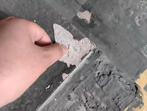 2.防水涂膜在陰角處有開裂 原因:涂刷于垂直立面的防水,在未完全干燥時會向下流動,使得防水材料在陰角和管根部位產(chǎn)生堆積,造成該部位防水材料堆積過厚,而防水表面由于水分揮發(fā)速度較快,迅速干燥結(jié)皮,而內(nèi)部沒有同時干燥固化,并在隨后的干燥固化中產(chǎn)生應(yīng)力將已經(jīng)結(jié)皮干燥的表層防水拉裂。 解決方案:對開裂的位置進行修補;在施工前做倒腳抹弧處理,同時避免材料在陰角和管根處堆積。如果開裂情況非常明顯,倒角就需要做大一些,倒角的圓弧直徑要大于30mm。